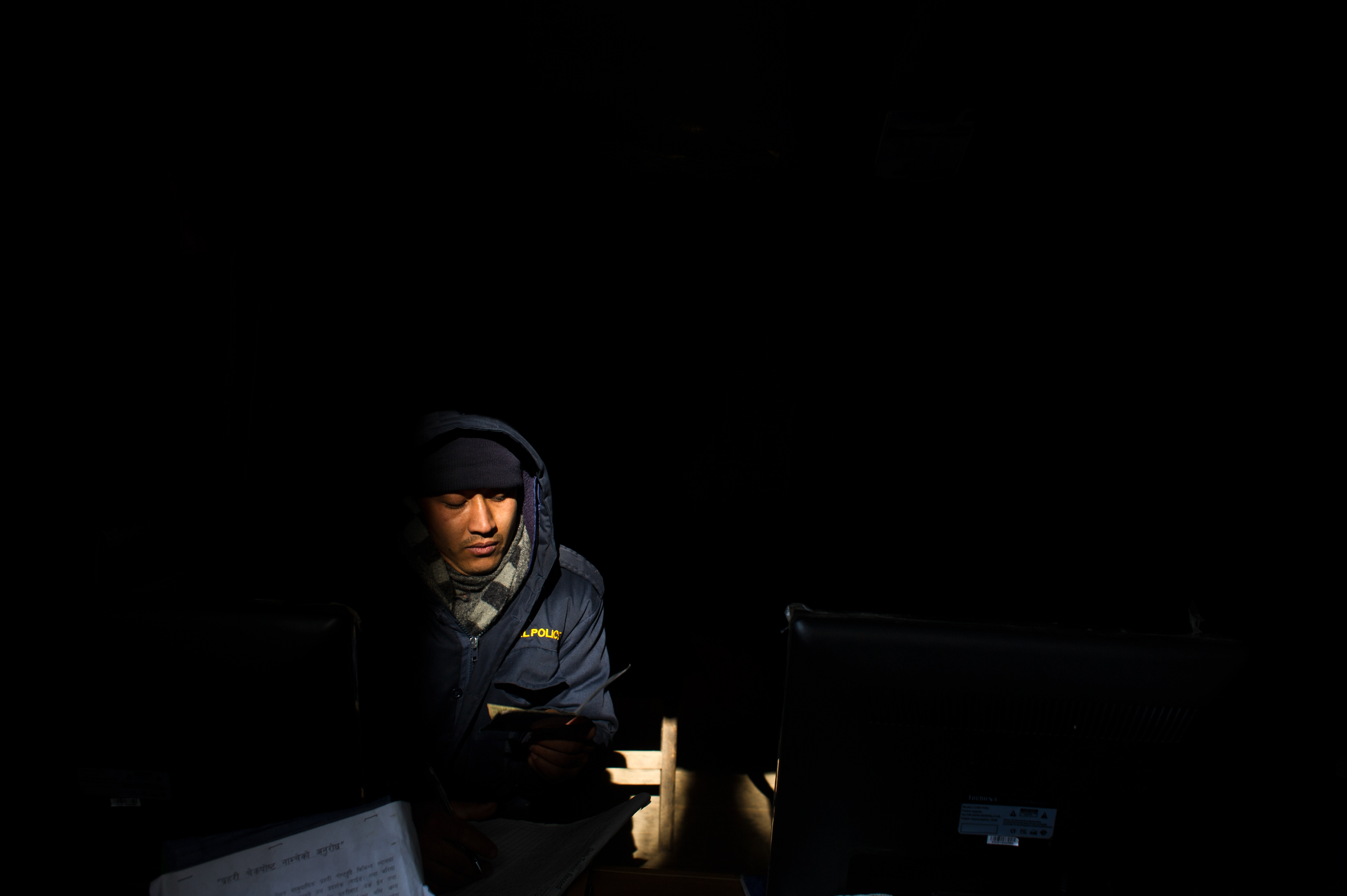 March 25, 2015 - NAMCHE, KHUMBU - A police officer sits at the checkpost outside Namche in Khumbu. The checkposts monitor Trekkers and help narrow the search radius should they go missing.