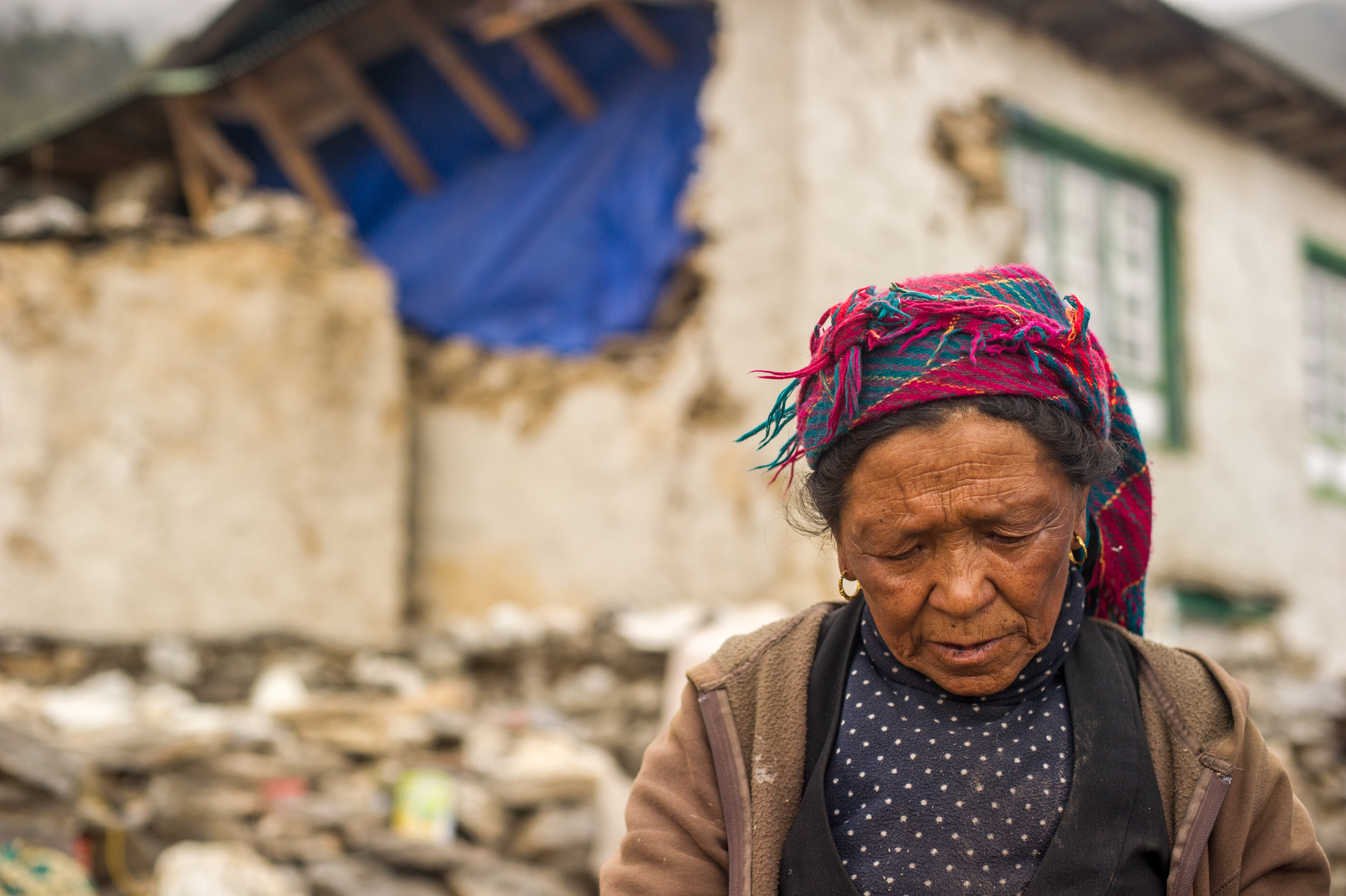 May 19, 2015 - KHUMJUNG, NEPAL - Lhakputi stands outside her house, patched together with donated tarps, as she builds a tent to sleep in in her potato field. Lhakputi said her husband died last year from stomach cancer and her son died this year in the avalanche at Everest Base Camp. She said she considered suicide, but there was nobody left to care for her yak.