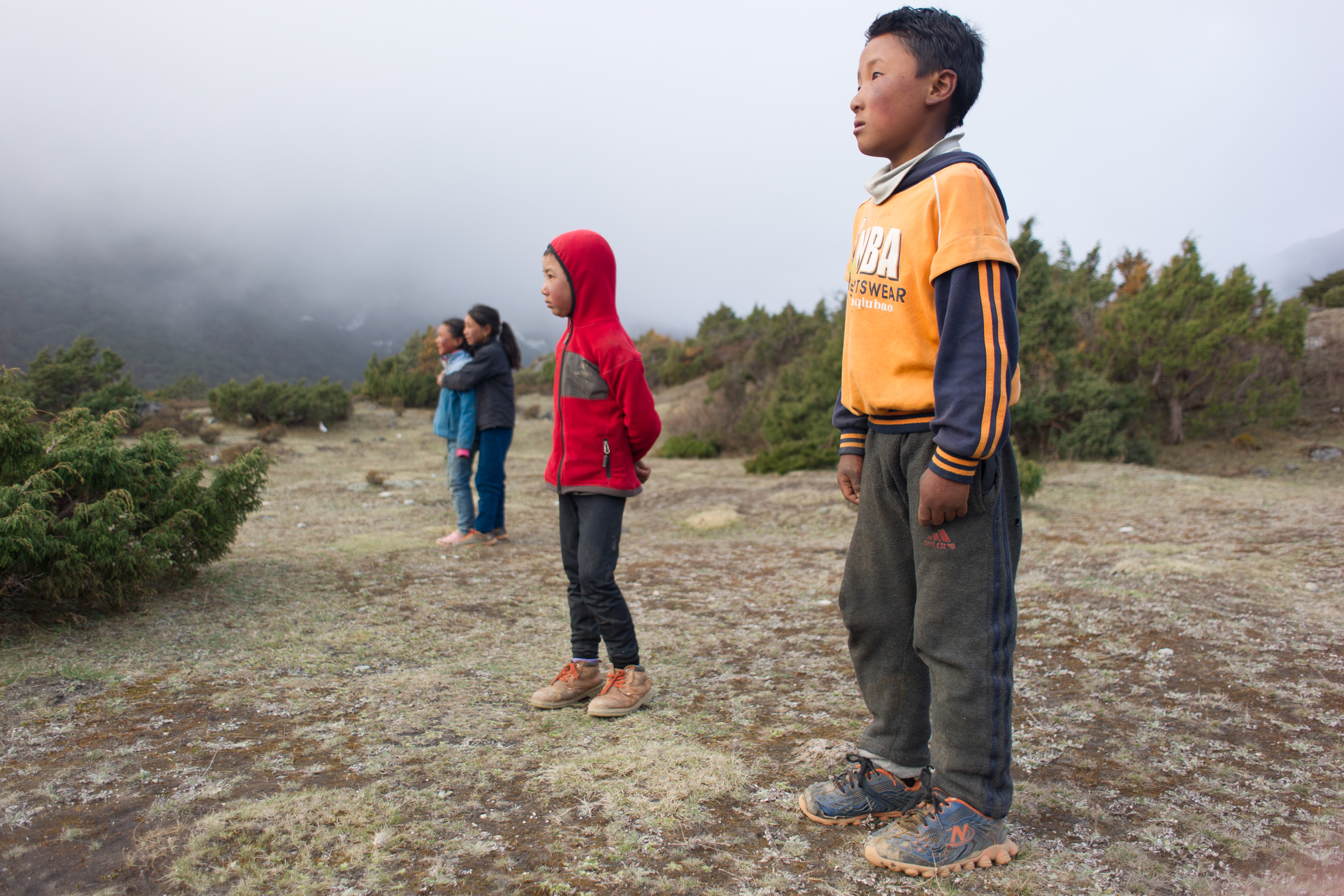 May 8, 2015 - THAME, KHUMBU - Kids from Thame watch for a helicopter bringing donated supplies to the area during an emergency relief campaign from Charok Lama Rinpoche and Kopan Monastery.