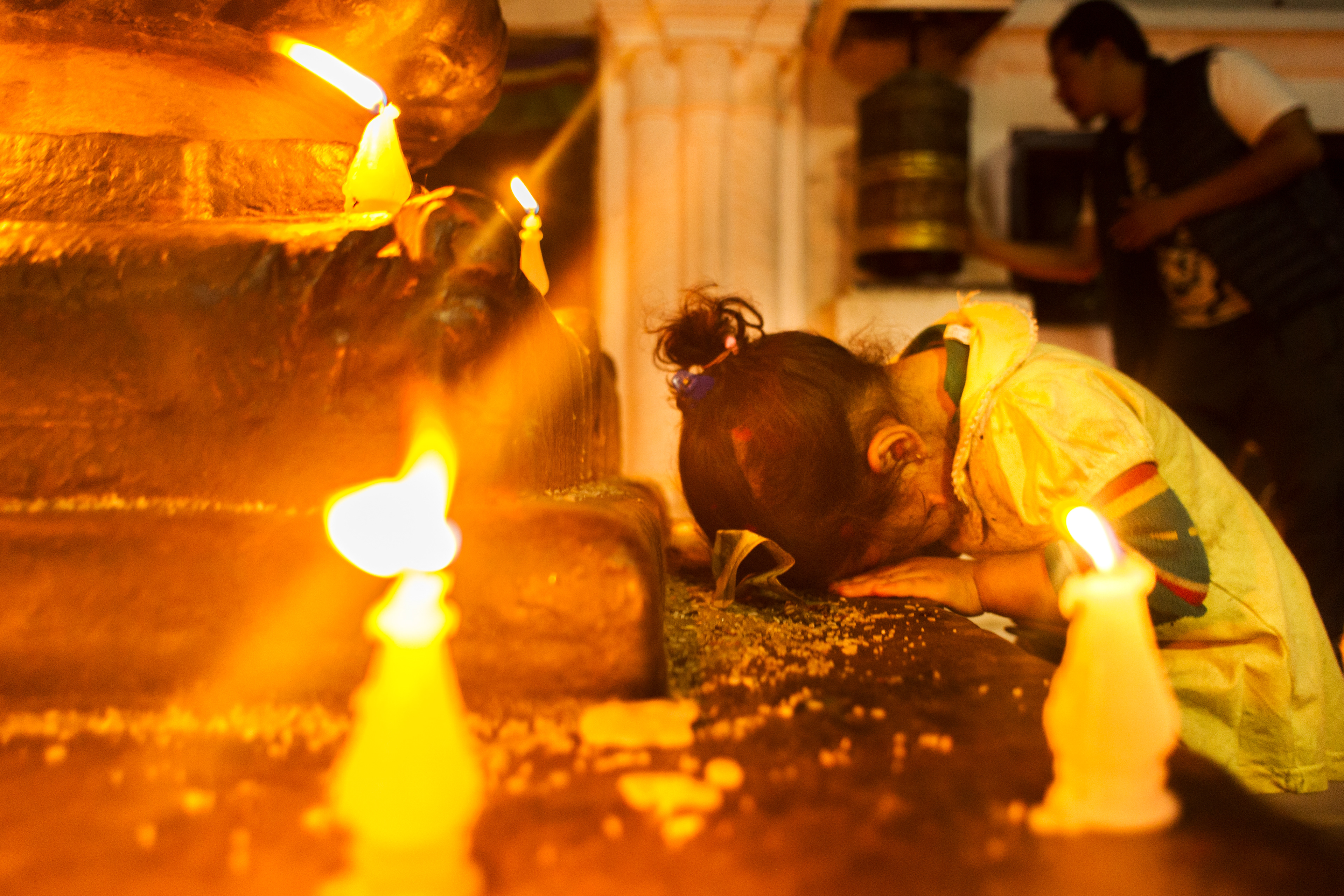 May 1, 2015 - KATHMANDU - A young girl prays at the foot of a statue of buddha at the Boudhanath Stupa in Kathmandu. The stupa, the largest in Nepal, was heavily damaged by the earthquake.
