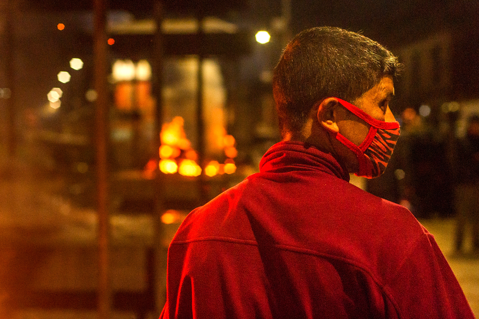 April 29, 2015- KATHMANDU- A cremator pushes a foot back into the fire during a night cremation at Pashupati temple in Kathmandu. The Hindu temple had to perform cremations 24/7 for weeks after the earthquake to meet demand.