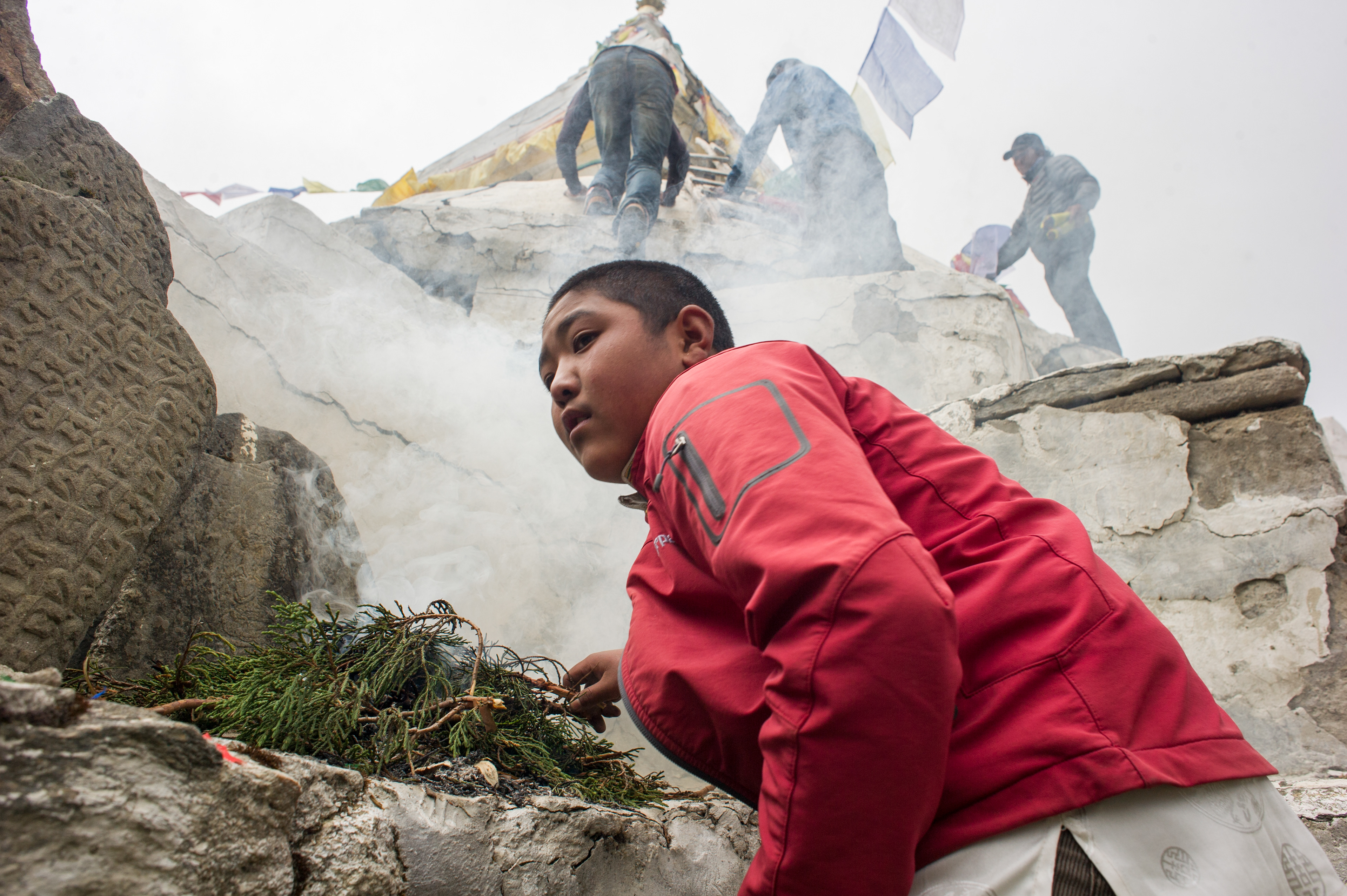 May 19, 2015- the Kunde community club burns incense as they hang prayer flags on the damaged stupa near the entrance to Kunde.