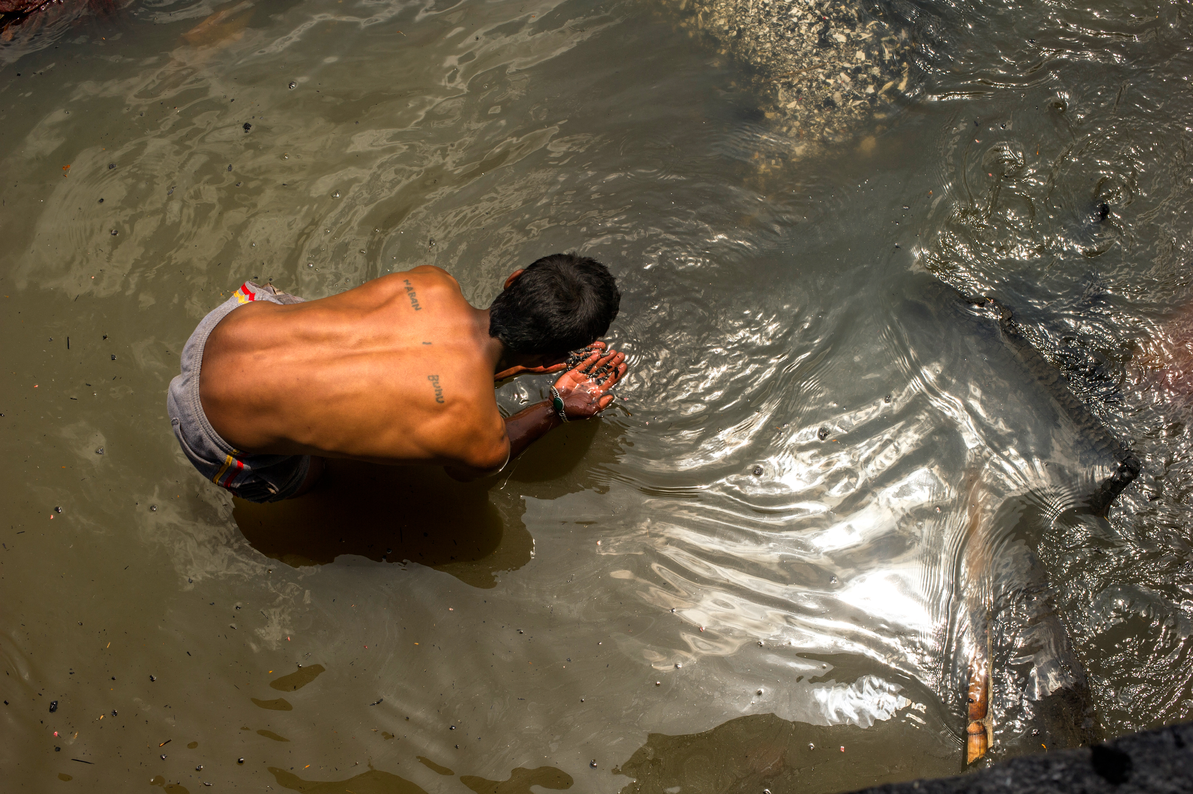 May 1, 2015 - KATHMANDU - A Dalit man sifts through human remains for gold teeth or coins in the Bagmati river beneath the cremation sites in Pashupatinath Temple. Though caste discrimination is illegal in Nepal, it is still practiced throughout the country, with Dalits at the bottom.