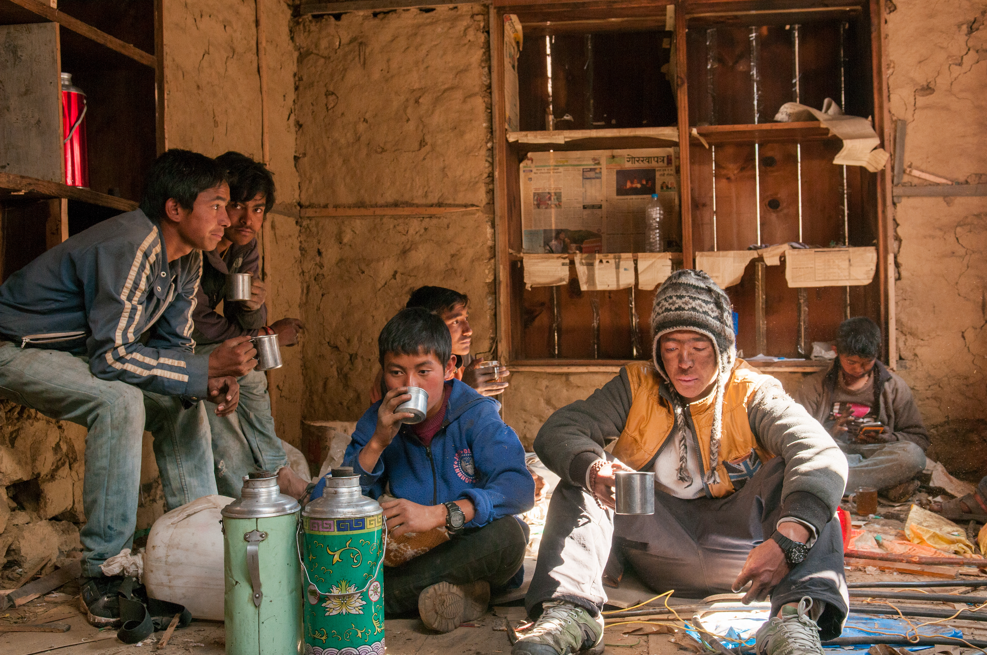 May 4, 2015 - NAMCHE, KHUMBU - Demolition workers drink su cha, a butter tea popular in the region, during a break from tearing down a damaged house in Namche.